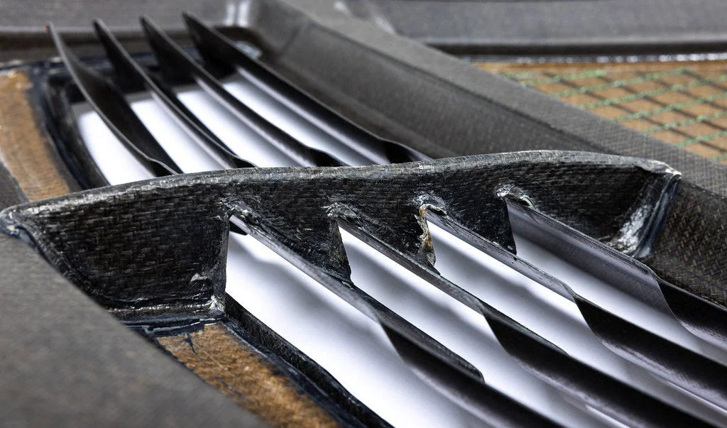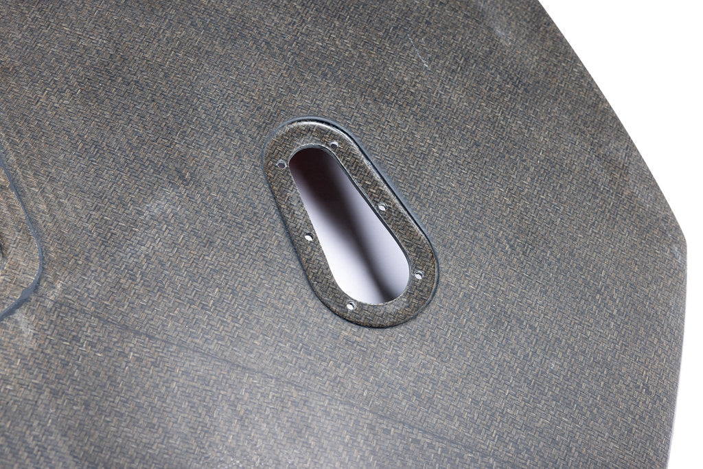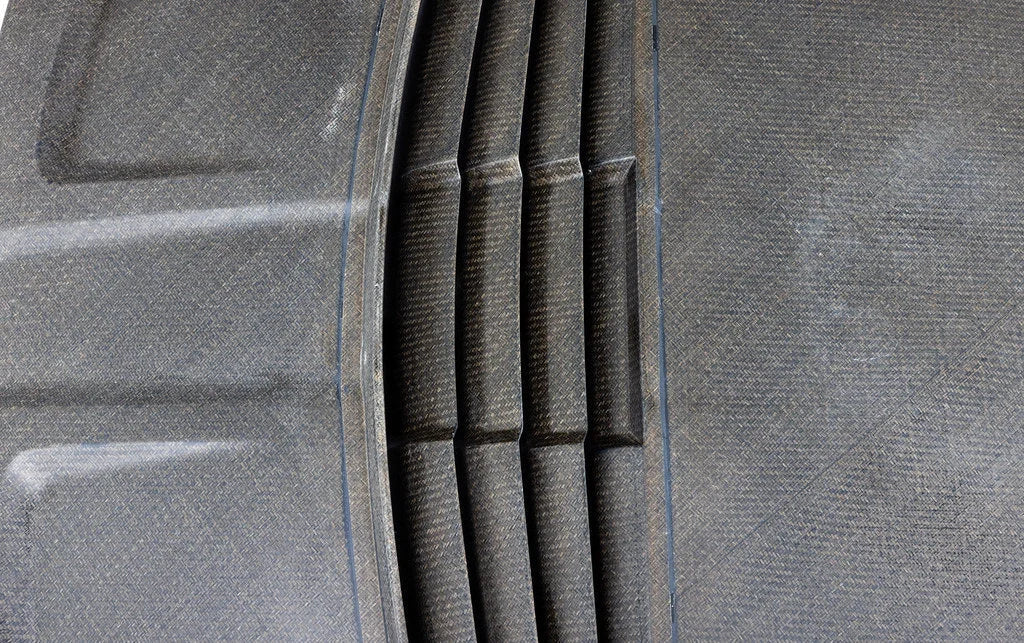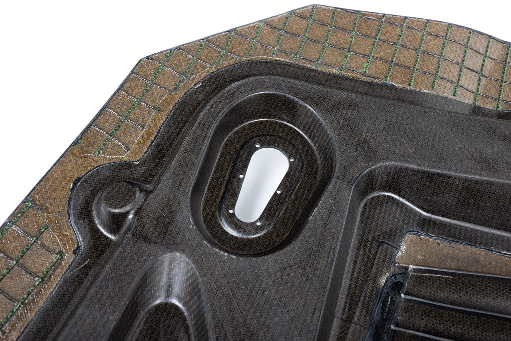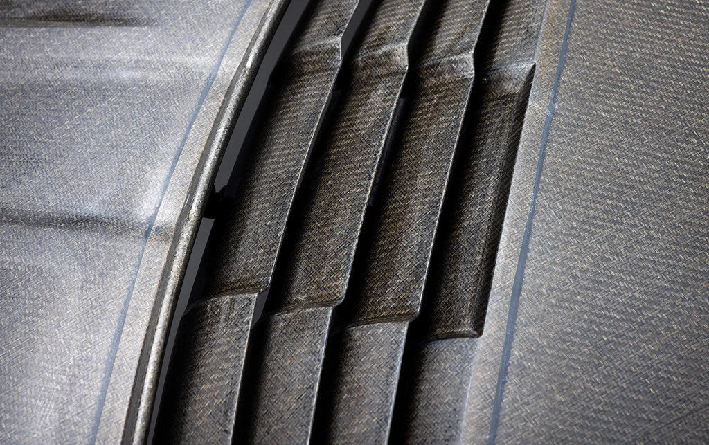 Inspired by leaf veins, the powerRibs reinforcement technology developed by Bcomp maximizes stiffness with minimal weight by creating a 3D structure on one side of a thin-walled shell element. This enables a decrease in the amount of base material used, thereby reducing weight, costs and consumables in production. The ampliTex reinforcements add a visible layer of flax fibres as a carbon-neutral replacement for the conventional covering material.