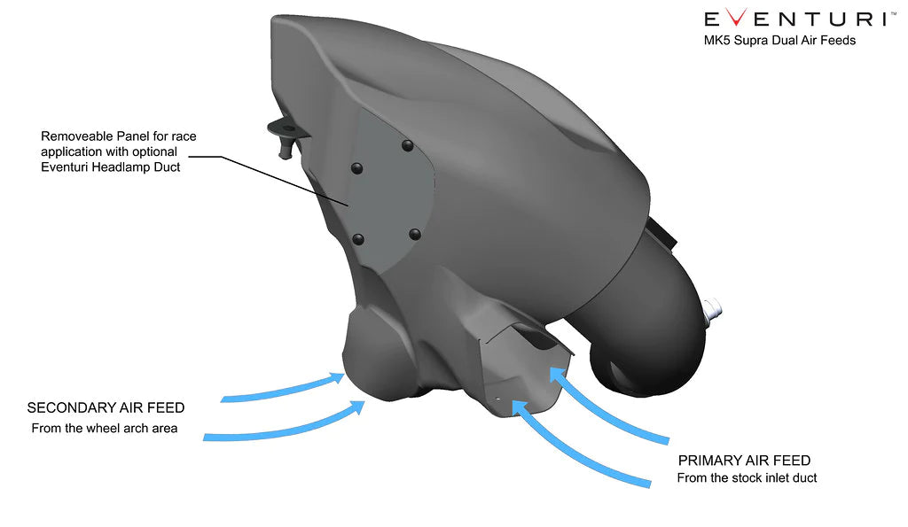 With the MKV Supra gaining popularity as a serious track car, we have developed a cold air feed to give you that extra edge. This headlamp duct replaces the OEM headlamp and provides a true RAM-AIR configuration with a direct cold air feed to the intake or stand-alone turbo. The duct follows the same lines as the stock headlamp and features two carbon air guides, one feeds the OEM air feed and the other feeds the entire airbox area. When used in conjunction with our Supra intake system, a panel on the intake duct can be removed exposing the filter to the extra airflow. With cold air being forced into the engine bay, heat soak is reduced allowing for multiple drag runs. Crafted from prepreg carbon fiber, the duct is has high structural strength and rigidity. Secured with laser cut stainless steel brackets on the OEM mounting points, it stays in position even at high speeds. Our Supra headlamp duct allows for the most direct cold air feed possible and significantly helps to reduce heat soak keeping track times consistent.
