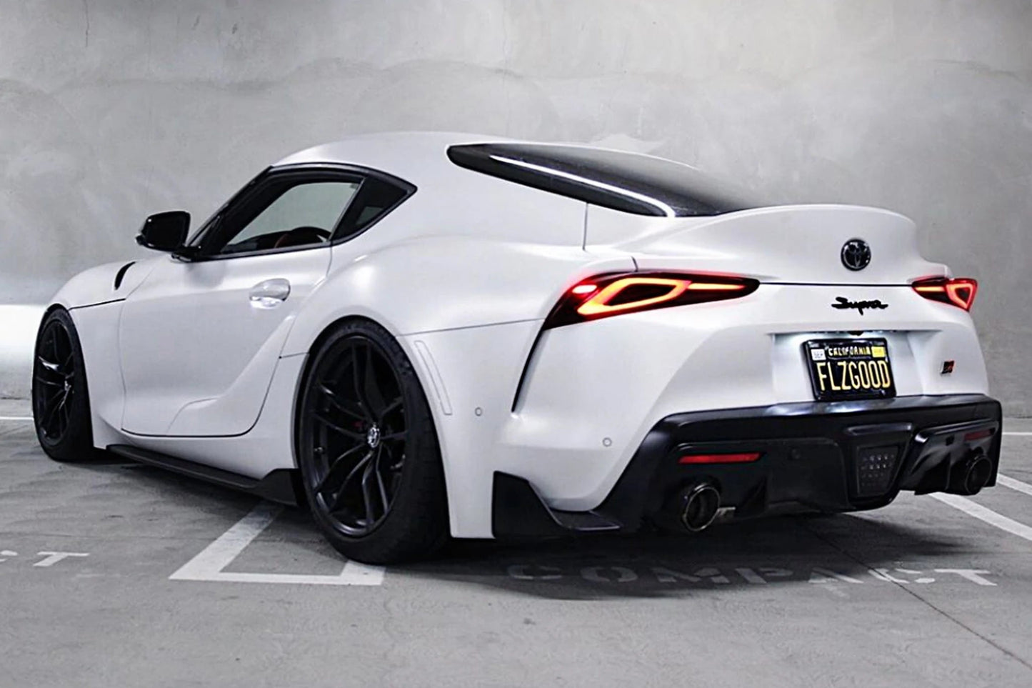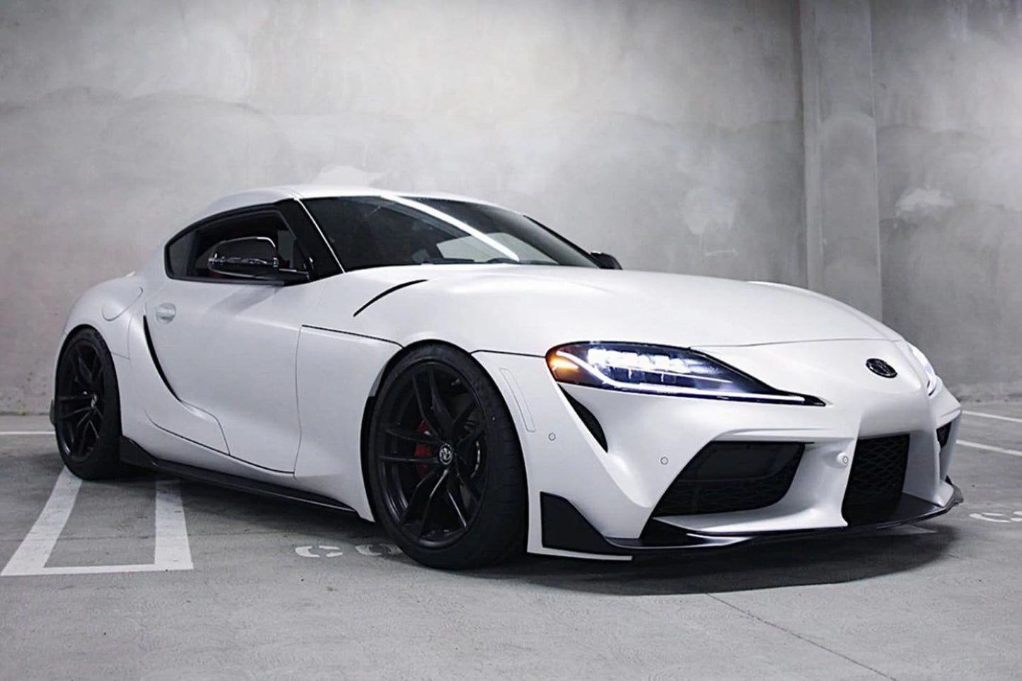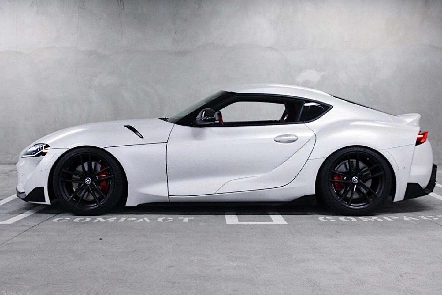 Absolute Zero White car is shown with HKS Height Adjustable Coilover Springs for A90 Supra + 15mm Future Classic spacers front and rear. For Supra owners on OEM suspension who seek a flush fitment, we recommend 12mm front and 15mm rear (Renaissance 2.0 Car).