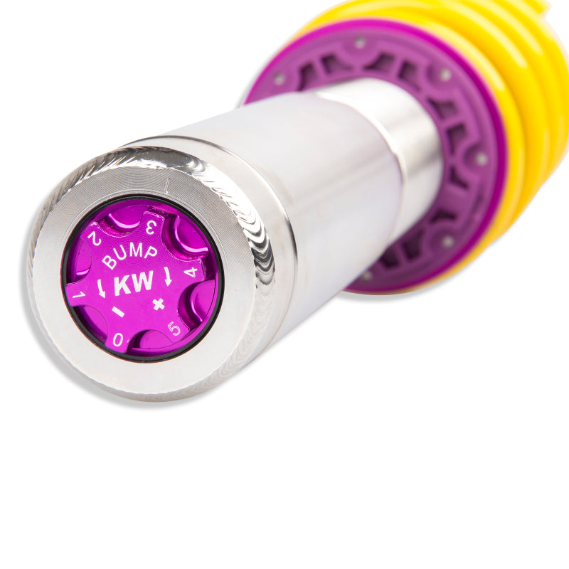 Cutting-edge motorsports technology -or more performance on the road. Like every suspension product developed by KW automotive and manufactured in Germany, the KW Variant 3 Coilover suspension kit also provides a significant improvment on the road. Thanks to the high-quality dampers, springs, and elastomer spring elements, pitching and rolling movements during load changes such as evasive maneuvers, cornering, acceleration, and braking are significantly reduced. The braking distances are also shortened. Thanks to improved support and feedback, drivers not only feel more confident but driving in everyday life is improved. With compression and rebound stage damping, that can be set separately and independently of each other, the damper setup can be customized to your personal driving preferences or vehicle changes such as weight, tire characteristics, or altered vehicle rigidity. True performance optimization is only possible with this unique, patented system. For example, this allows the compression damping force to be increased and get more grip from the tires, to improve cornering behavior and reduce squat without simultaneously altering the rebound stage damping which is optimally matched to the spring rate ? a scenario which results in reduced grip and the associated loss of performance. The KW Variant 3 INOX-LINE coilover kit is the ideal tool for performance-oriented drivers and experienced tuning enthusiasts who place a strong emphasis on the overall performance of their suspension. The Variant 3 features patented TVR-A and TVC-A technology -hat provides separately adjustable rebound and compression damping. The extensive Adjustment -ange of the independently configurable rebound and compression make it easy to directly influence the steering behavior, directional stability, grip and handling characteristics for confident and repeatable results at the limit of driving dynamics.