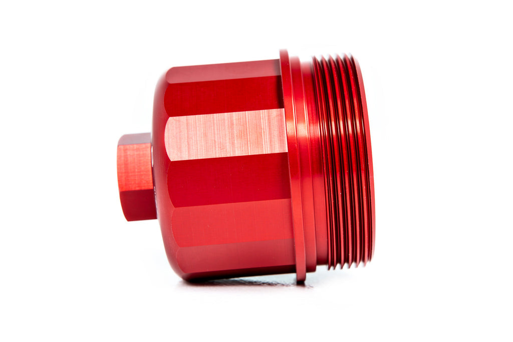 The Billet Oil Filter Cap is installed in the exact same manner as the OEM cap, using the same O-Ring that comes supplied with new oil filters. Furthermore, a drain plug has been integrated in the design of our Oil Filter Cap which is not featured on the OEM design. The drain plug allows for less mess when changing the filter. The OEM cap would be full of oil when being removed causing oil to spill all over the cap. Simply remove the drain plug to let most of the oil drain into the pan, then remove the Weistec oil filter cap to change the filter. Install is simple, requiring that you only swap the factory filter stock over from the OEM cap.